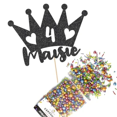 Cakeshop Cake Decoration Pack Princess Crown Premium Double Sided Glitter Card Topper Sign & 25g Party of Sugar Sprinkles Custom Name Age Decorations (Black)
