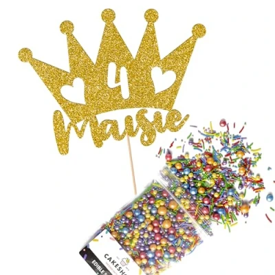 Cakeshop Cake Decoration Pack Princess Crown Premium Double Sided Glitter Card Topper Sign & 25g Party of Sugar Sprinkles Custom Name Age Decorations (Gold)