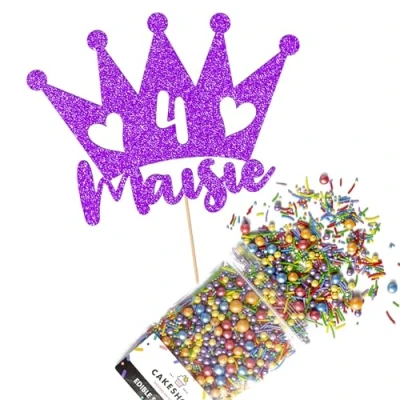 Cakeshop Cake Decoration Pack Princess Crown Premium Double Sided Glitter Card Topper Sign & 25g Party of Sugar Sprinkles Custom Name Age Decorations (Purple)