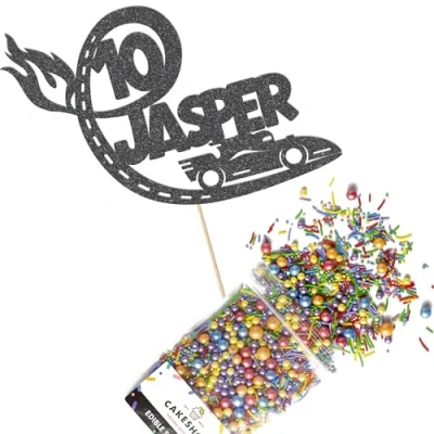 Cakeshop Cake Decoration Pack Racing Car Birthday Premium Double Sided Glitter Card Topper & 25g Party of Sugar Sprinkles Custom Name Age Decorations (Black)