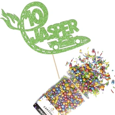Cakeshop Cake Decoration Pack Racing Car Birthday Premium Double Sided Glitter Card Topper & 25g Party of Sugar Sprinkles Custom Name Age Decorations (Green)