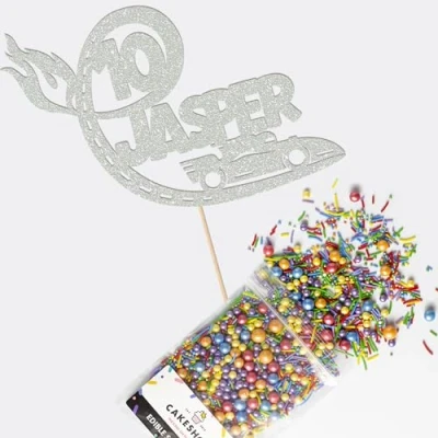 This Cakeshop Cake Decorating Pack includes 1 x 480gsm Double Sided Glitter Card Topper & 25g Cake Sprinkles (option to upgrade to 50g while customising) - perfect for your party or celebration! Cakeshop Sprinkles are Vegan, Gluten Free, Lactose free and Nut Free, all while looking amazing in striking colours and an assortment of sizes for a truly 'premium' finish Size: Sprinkles pack (perfect for a large cake) 25g, you can also upgrade to a 50g pack when customising your topper | Glitter Topper Approx 152mm (6") x 175mm (7") Toppers make a great keepsake to remember this special occasion forever, often our customers will remove the support sick and use on bedroom doors (until their next birthday!) Cakeshop Glitter Toppers are made from 480gsm premium double sided glitter card, select which colour topper you'd like then click 'Customise' to add your text personalisation and choose your sprinkles Choose from either Metallic or Rainbow sprinkles and upgrade to 50g packs in the 'Customise' section, so that you can match your sprinkles to your theme (or save them for next time!) All 'Cakeshop Cake Decorating Packs' come beautifully packed with simple to understand instructions so that you can quickly turn any cake, home made or shop bought (we wont tell!) into the perfect cake After you have added your custom information in the 'Customise Now' section our designers hand make your topper in the same font, style and topper colour as the design you've selected Cakeshop have been making the highest quality Cake Decorations since 2011 - we have thousands of design options available in our store for every occasion and theme (click 'visit the cakeshop store' above) It should go without saying - but Glitter Card toppers are flamable! We therefore recommend using only Acrylic toppers alongside candles for safety