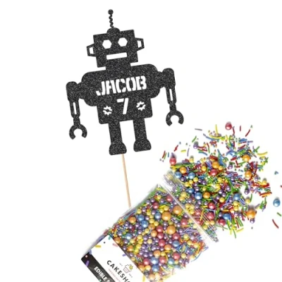 Cakeshop Cake Decoration Pack Robot Alien Birthday Premium Double Sided Glitter Card Topper & 25g Party of Sugar Sprinkles Custom Name Age Decorations (Black)