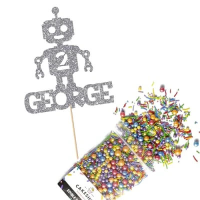 Cakeshop Cake Decoration Pack Robot Alien Birthday Premium Double Sided Glitter Card Topper & 25g Party of Sugar Sprinkles Custom Name Age Decorations (Dark Silver)