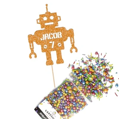 Cakeshop Cake Decoration Pack Robot Alien Birthday Premium Double Sided Glitter Card Topper & 25g Party of Sugar Sprinkles Custom Name Age Decorations (Orange)