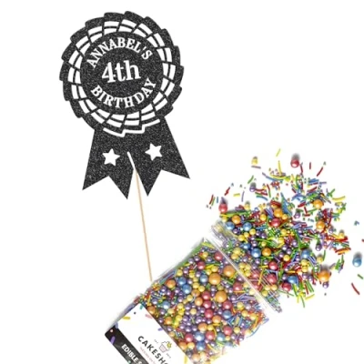 This Cakeshop Cake Decorating Pack includes 1 x 480gsm Double Sided Glitter Card Topper & 25g Cake Sprinkles (option to upgrade to 50g while customising) - perfect for your party or celebration! Cakeshop Sprinkles are Vegan, Gluten Free, Lactose free and Nut Free, all while looking amazing in striking colours and an assortment of sizes for a truly 'premium' finish Size: Sprinkles pack (perfect for a large cake) 25g, you can also upgrade to a 50g pack when customising your topper | Glitter Topper Approx 152mm (6") x 175mm (7") Toppers make a great keepsake to remember this special occasion forever, often our customers will remove the support sick and use on bedroom doors (until their next birthday!) Cakeshop Glitter Toppers are made from 480gsm premium double sided glitter card, select which colour topper you'd like then click 'Customise' to add your text personalisation and choose your sprinkles Choose from either Metallic or Rainbow sprinkles and upgrade to 50g packs in the 'Customise' section, so that you can match your sprinkles to your theme (or save them for next time!) All 'Cakeshop Cake Decorating Packs' come beautifully packed with simple to understand instructions so that you can quickly turn any cake, home made or shop bought (we wont tell!) into the perfect cake After you have added your custom information in the 'Customise Now' section our designers hand make your topper in the same font, style and topper colour as the design you've selected Cakeshop have been making the highest quality Cake Decorations since 2011 - we have thousands of design options available in our store for every occasion and theme (click 'visit the cakeshop store' above) It should go without saying - but Glitter Card toppers are flamable! We therefore recommend using only Acrylic toppers alongside candles for safety