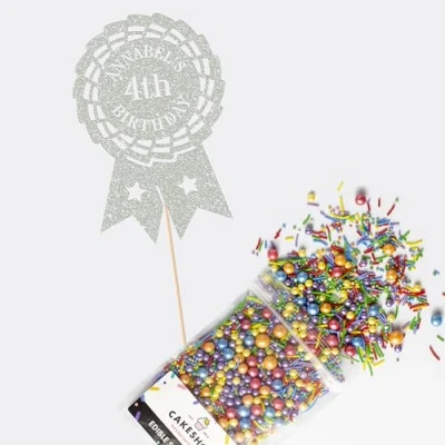 This Cakeshop Cake Decorating Pack includes 1 x 480gsm Double Sided Glitter Card Topper & 25g Cake Sprinkles (option to upgrade to 50g while customising) - perfect for your party or celebration! Cakeshop Sprinkles are Vegan, Gluten Free, Lactose free and Nut Free, all while looking amazing in striking colours and an assortment of sizes for a truly 'premium' finish Size: Sprinkles pack (perfect for a large cake) 25g, you can also upgrade to a 50g pack when customising your topper | Glitter Topper Approx 152mm (6") x 175mm (7") Toppers make a great keepsake to remember this special occasion forever, often our customers will remove the support sick and use on bedroom doors (until their next birthday!) Cakeshop Glitter Toppers are made from 480gsm premium double sided glitter card, select which colour topper you'd like then click 'Customise' to add your text personalisation and choose your sprinkles Choose from either Metallic or Rainbow sprinkles and upgrade to 50g packs in the 'Customise' section, so that you can match your sprinkles to your theme (or save them for next time!) All 'Cakeshop Cake Decorating Packs' come beautifully packed with simple to understand instructions so that you can quickly turn any cake, home made or shop bought (we wont tell!) into the perfect cake After you have added your custom information in the 'Customise Now' section our designers hand make your topper in the same font, style and topper colour as the design you've selected Cakeshop have been making the highest quality Cake Decorations since 2011 - we have thousands of design options available in our store for every occasion and theme (click 'visit the cakeshop store' above) It should go without saying - but Glitter Card toppers are flamable! We therefore recommend using only Acrylic toppers alongside candles for safety