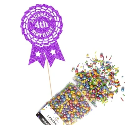 Cakeshop Cake Decoration Pack Rosette Happy Birthday Premium Double Sided Glitter Card Topper & 25g Party of Sugar Sprinkles Custom Name Age Decorations (Purple)