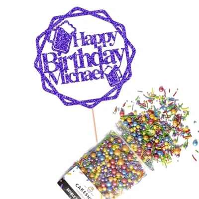 Cakeshop Cake Decoration Pack Round Beers Happy Birthday Premium Double Sided Glitter Card Topper & 25g Party of Sugar Sprinkles Custom Name Decorations (Bright Blue)