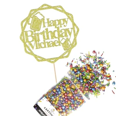Cakeshop Cake Decoration Pack Round Beers Happy Birthday Premium Double Sided Glitter Card Topper & 25g Party of Sugar Sprinkles Custom Name Decorations (Champagne)