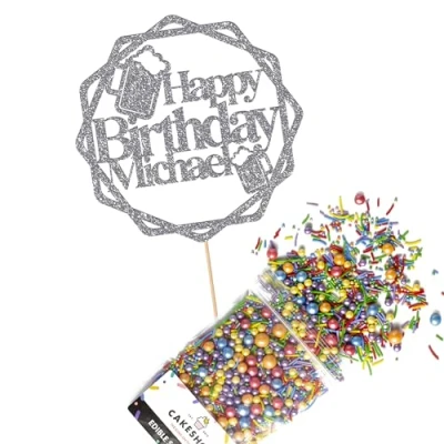 Cakeshop Cake Decoration Pack Round Beers Happy Birthday Premium Double Sided Glitter Card Topper & 25g Party of Sugar Sprinkles Custom Name Decorations (Dark Silver)