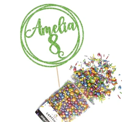 Cakeshop Cake Decoration Pack Round Happy Birthday Premium Double Sided Glitter Card Topper & 25g Party of Sugar Sprinkles Custom Name Age Decorations (Green)