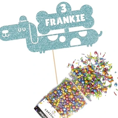 Cakeshop Cake Decoration Pack Sausage Dog Birthday Premium Double Sided Glitter Card Topper & 25g Party of Sugar Sprinkles Custom Name Age (Baby Blue)