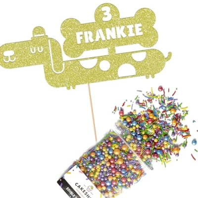 Cakeshop Cake Decoration Pack Sausage Dog Birthday Premium Double Sided Glitter Card Topper & 25g Party of Sugar Sprinkles Custom Name Age (Champagne)