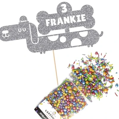 Cakeshop Cake Decoration Pack Sausage Dog Birthday Premium Double Sided Glitter Card Topper & 25g Party of Sugar Sprinkles Custom Name Age (Dark Silver)