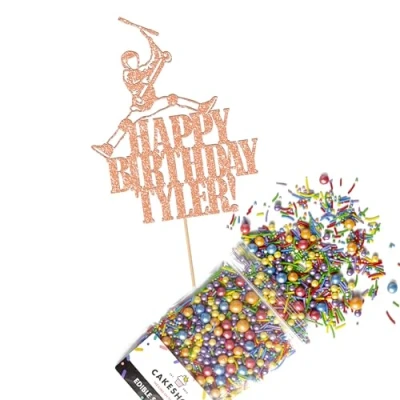 This Cakeshop Cake Decorating Pack includes 1 x 480gsm Double Sided Glitter Card Topper & 25g Cake Sprinkles (option to upgrade to 50g while customising) - perfect for your party or celebration! Cakeshop Sprinkles are Vegan, Gluten Free, Lactose free and Nut Free, all while looking amazing in striking colours and an assortment of sizes for a truly 'premium' finish Size: Sprinkles pack (perfect for a large cake) 25g, you can also upgrade to a 50g pack when customising your topper | Glitter Topper Approx 152mm (6") x 175mm (7") Toppers make a great keepsake to remember this special occasion forever, often our customers will remove the support sick and use on bedroom doors (until their next birthday!) Cakeshop Glitter Toppers are made from 480gsm premium double sided glitter card, select which colour topper you'd like then click 'Customise' to add your text personalisation and choose your sprinkles Choose from either Metallic or Rainbow sprinkles and upgrade to 50g packs in the 'Customise' section, so that you can match your sprinkles to your theme (or save them for next time!) All 'Cakeshop Cake Decorating Packs' come beautifully packed with simple to understand instructions so that you can quickly turn any cake, home made or shop bought (we wont tell!) into the perfect cake After you have added your custom information in the 'Customise Now' section our designers hand make your topper in the same font, style and topper colour as the design you've selected Cakeshop have been making the highest quality Cake Decorations since 2011 - we have thousands of design options available in our store for every occasion and theme (click 'visit the cakeshop store' above) It should go without saying - but Glitter Card toppers are flamable! We therefore recommend using only Acrylic toppers alongside candles for safety