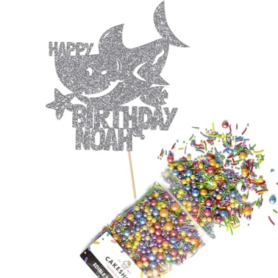 Cakeshop Cake Decoration Pack Shark Birthday Party Theme Premium Double Sided Glitter Card Topper & 25g of Sugar Sprinkles Custom Name Decorations (Dark Silver)