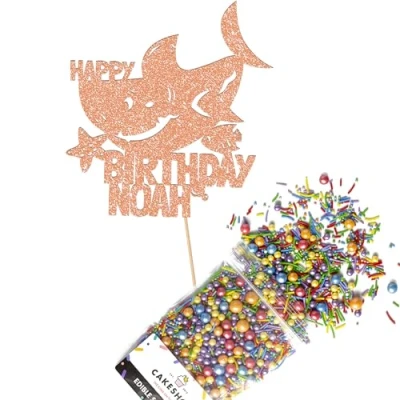 Cakeshop Cake Decoration Pack Shark Birthday Party Theme Premium Double Sided Glitter Card Topper & 25g of Sugar Sprinkles Custom Name Decorations (Rose Gold)