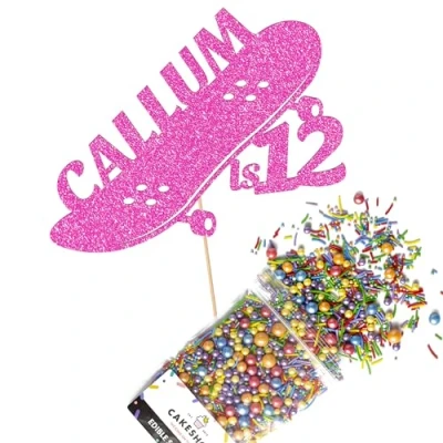 Cakeshop Cake Decoration Pack Skateboard Theme Premium Double Sided Glitter Card Topper Sign & 25g Party of Sugar Sprinkles Custom Name Age Decorations (Baby Pink)