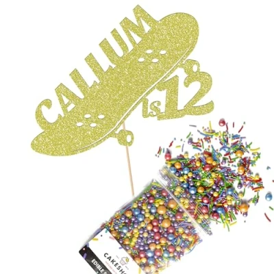 Cakeshop Cake Decoration Pack Skateboard Theme Premium Double Sided Glitter Card Topper Sign & 25g Party of Sugar Sprinkles Custom Name Age Decorations (Champagne)