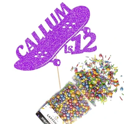 Cakeshop Cake Decoration Pack Skateboard Theme Premium Double Sided Glitter Card Topper Sign & 25g Party of Sugar Sprinkles Custom Name Age Decorations (Purple)