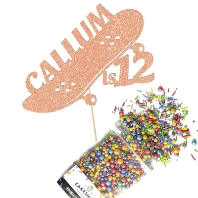 Cakeshop Cake Decoration Pack Skateboard Theme Premium Double Sided Glitter Card Topper Sign & 25g Party of Sugar Sprinkles Custom Name Age Decorations (Rose Gold)
