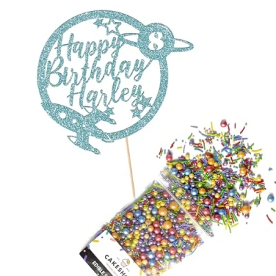 Cakeshop Cake Decoration Pack Space Rocket Planet Premium Double Sided Glitter Card Topper & 25g Party of Sugar Sprinkles Custom Name Age Decorations (Baby Blue)