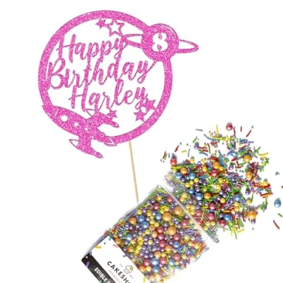 Cakeshop Cake Decoration Pack Space Rocket Planet Premium Double Sided Glitter Card Topper & 25g Party of Sugar Sprinkles Custom Name Age Decorations (Baby Pink)