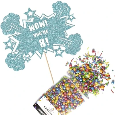 Cakeshop Cake Decoration Pack Superhero Comic Birthday Premium Double Sided Glitter Card Topper Sign & 25g Party of Sugar Sprinkles Custom Age Decorations (Baby Blue)