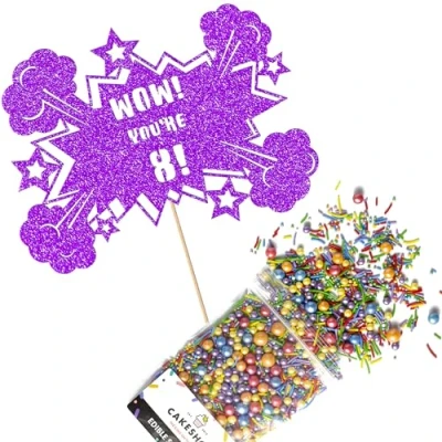Cakeshop Cake Decoration Pack Superhero Comic Birthday Premium Double Sided Glitter Card Topper Sign & 25g Party of Sugar Sprinkles Custom Age Decorations (Purple)