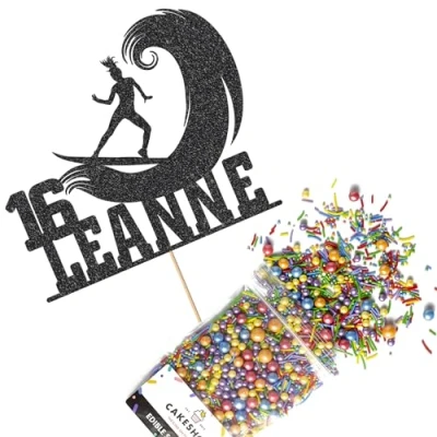 Cakeshop Cake Decoration Pack Surfer Surfing Theme Premium Double Sided Glitter Card Topper & 25g Party of Sugar Sprinkles Custom Name Age Decorations (Black)