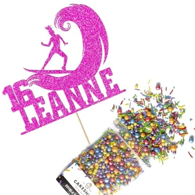 Cakeshop Cake Decoration Pack Surfer Surfing Theme Premium Double Sided Glitter Card Topper & 25g Party of Sugar Sprinkles Custom Name Age Decorations (Bright Pink)