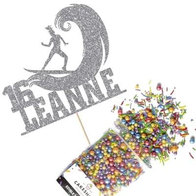 Cakeshop Cake Decoration Pack Surfer Surfing Theme Premium Double Sided Glitter Card Topper & 25g Party of Sugar Sprinkles Custom Name Age Decorations (Dark Silver)