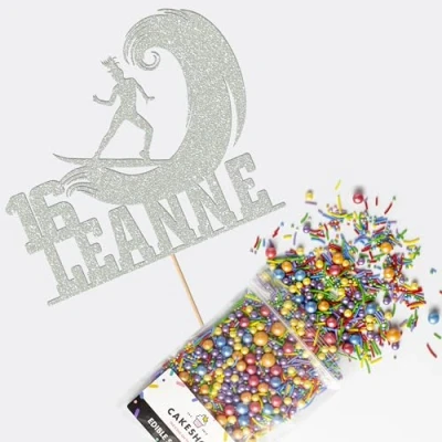 Cakeshop Cake Decoration Pack Surfer Surfing Theme Premium Double Sided Glitter Card Topper & 25g Party of Sugar Sprinkles Custom Name Age Decorations (Light Silver)