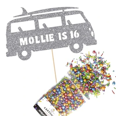 Cakeshop Cake Decoration Pack Surfing Campervan Theme Premium Double Sided Glitter Card Topper & 25g Party of Sugar Sprinkles Custom Name Age (Dark Silver)