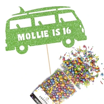 Cakeshop Cake Decoration Pack Surfing Campervan Theme Premium Double Sided Glitter Card Topper & 25g Party of Sugar Sprinkles Custom Name Age (Green)