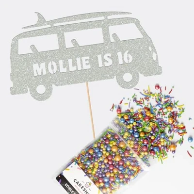 Cakeshop Cake Decoration Pack Surfing Campervan Theme Premium Double Sided Glitter Card Topper & 25g Party of Sugar Sprinkles Custom Name Age (Light Silver)