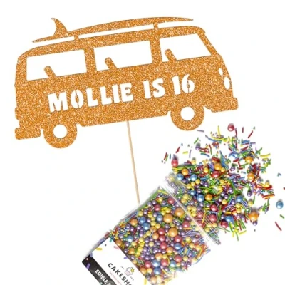 Cakeshop Cake Decoration Pack Surfing Campervan Theme Premium Double Sided Glitter Card Topper & 25g Party of Sugar Sprinkles Custom Name Age (Orange)