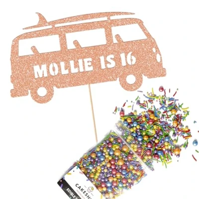 Cakeshop Cake Decoration Pack Surfing Campervan Theme Premium Double Sided Glitter Card Topper & 25g Party of Sugar Sprinkles Custom Name Age (Rose Gold)