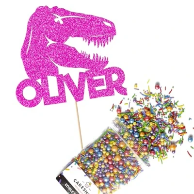 Cakeshop Cake Decoration Pack T Rex Dinosaur Birthday Premium Double Sided Glitter Card Topper Sign & 25g Party of Sugar Sprinkles Custom Name Decorations (Bright Pink)