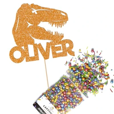 Cakeshop Cake Decoration Pack T Rex Dinosaur Birthday Premium Double Sided Glitter Card Topper Sign & 25g Party of Sugar Sprinkles Custom Name Decorations (Orange)