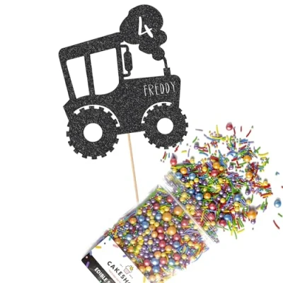 Cakeshop Cake Decoration Pack Tractor Farm Theme Premium Double Sided Glitter Card Topper Sign & 25g Party of Sugar Sprinkles Custom Name Age (Black)