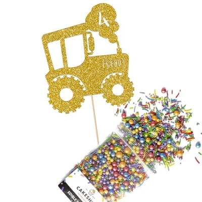 Cakeshop Cake Decoration Pack Tractor Farm Theme Premium Double Sided Glitter Card Topper Sign & 25g Party of Sugar Sprinkles Custom Name Age (Gold)