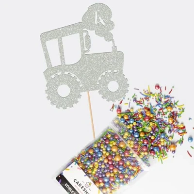 Cakeshop Cake Decoration Pack Tractor Farm Theme Premium Double Sided Glitter Card Topper Sign & 25g Party of Sugar Sprinkles Custom Name Age (Light Silver)