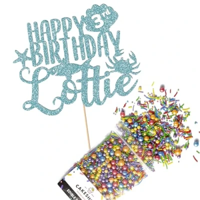 Cakeshop Cake Decoration Pack Under The Sea Premium Double Sided Glitter Card Topper Sign & 25g Party of Sugar Sprinkles Custom Name Age Decorations (Baby Blue)