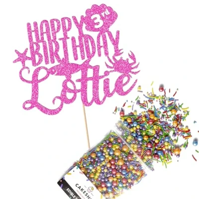 Cakeshop Cake Decoration Pack Under The Sea Premium Double Sided Glitter Card Topper Sign & 25g Party of Sugar Sprinkles Custom Name Age Decorations (Baby Pink)
