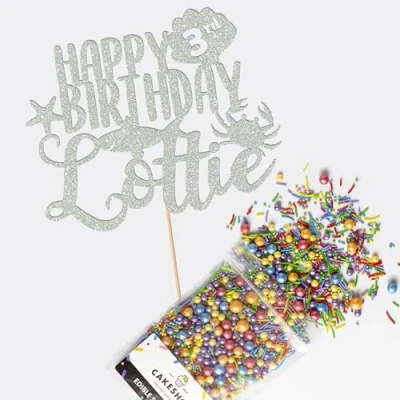 This Cakeshop Cake Decorating Pack includes 1 x 480gsm Double Sided Glitter Card Topper & 25g Cake Sprinkles (option to upgrade to 50g while customising) - perfect for your party or celebration! Cakeshop Sprinkles are Vegan, Gluten Free, Lactose free and Nut Free, all while looking amazing in striking colours and an assortment of sizes for a truly 'premium' finish Size: Sprinkles pack (perfect for a large cake) 25g, you can also upgrade to a 50g pack when customising your topper | Glitter Topper Approx 152mm (6") x 175mm (7") Toppers make a great keepsake to remember this special occasion forever, often our customers will remove the support sick and use on bedroom doors (until their next birthday!) Cakeshop Glitter Toppers are made from 480gsm premium double sided glitter card, select which colour topper you'd like then click 'Customise' to add your text personalisation and choose your sprinkles Choose from either Metallic or Rainbow sprinkles and upgrade to 50g packs in the 'Customise' section, so that you can match your sprinkles to your theme (or save them for next time!) All 'Cakeshop Cake Decorating Packs' come beautifully packed with simple to understand instructions so that you can quickly turn any cake, home made or shop bought (we wont tell!) into the perfect cake After you have added your custom information in the 'Customise Now' section our designers hand make your topper in the same font, style and topper colour as the design you've selected Cakeshop have been making the highest quality Cake Decorations since 2011 - we have thousands of design options available in our store for every occasion and theme (click 'visit the cakeshop store' above) It should go without saying - but Glitter Card toppers are flamable! We therefore recommend using only Acrylic toppers alongside candles for safety