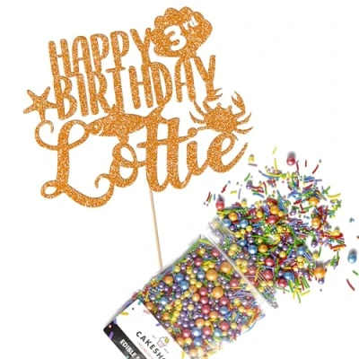 This Cakeshop Cake Decorating Pack includes 1 x 480gsm Double Sided Glitter Card Topper & 25g Cake Sprinkles (option to upgrade to 50g while customising) - perfect for your party or celebration! Cakeshop Sprinkles are Vegan, Gluten Free, Lactose free and Nut Free, all while looking amazing in striking colours and an assortment of sizes for a truly 'premium' finish Size: Sprinkles pack (perfect for a large cake) 25g, you can also upgrade to a 50g pack when customising your topper | Glitter Topper Approx 152mm (6") x 175mm (7") Toppers make a great keepsake to remember this special occasion forever, often our customers will remove the support sick and use on bedroom doors (until their next birthday!) Cakeshop Glitter Toppers are made from 480gsm premium double sided glitter card, select which colour topper you'd like then click 'Customise' to add your text personalisation and choose your sprinkles Choose from either Metallic or Rainbow sprinkles and upgrade to 50g packs in the 'Customise' section, so that you can match your sprinkles to your theme (or save them for next time!) All 'Cakeshop Cake Decorating Packs' come beautifully packed with simple to understand instructions so that you can quickly turn any cake, home made or shop bought (we wont tell!) into the perfect cake After you have added your custom information in the 'Customise Now' section our designers hand make your topper in the same font, style and topper colour as the design you've selected Cakeshop have been making the highest quality Cake Decorations since 2011 - we have thousands of design options available in our store for every occasion and theme (click 'visit the cakeshop store' above) It should go without saying - but Glitter Card toppers are flamable! We therefore recommend using only Acrylic toppers alongside candles for safety