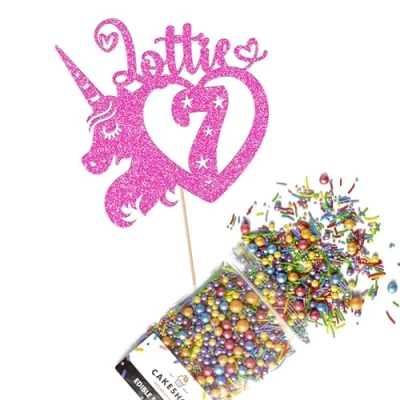 Cakeshop Cake Decoration Pack Unicorn Heart Premium Double Sided Glitter Card Topper Sign & 25g Party of Sugar Sprinkles Custom Name Age Decorations (Baby Pink)