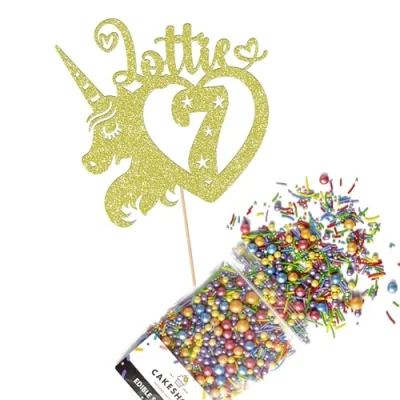 Cakeshop Cake Decoration Pack Unicorn Heart Premium Double Sided Glitter Card Topper Sign & 25g Party of Sugar Sprinkles Custom Name Age Decorations (Champagne)